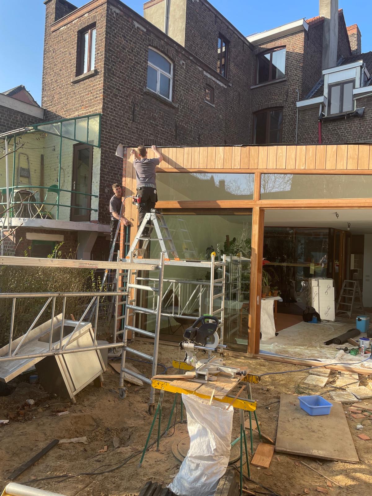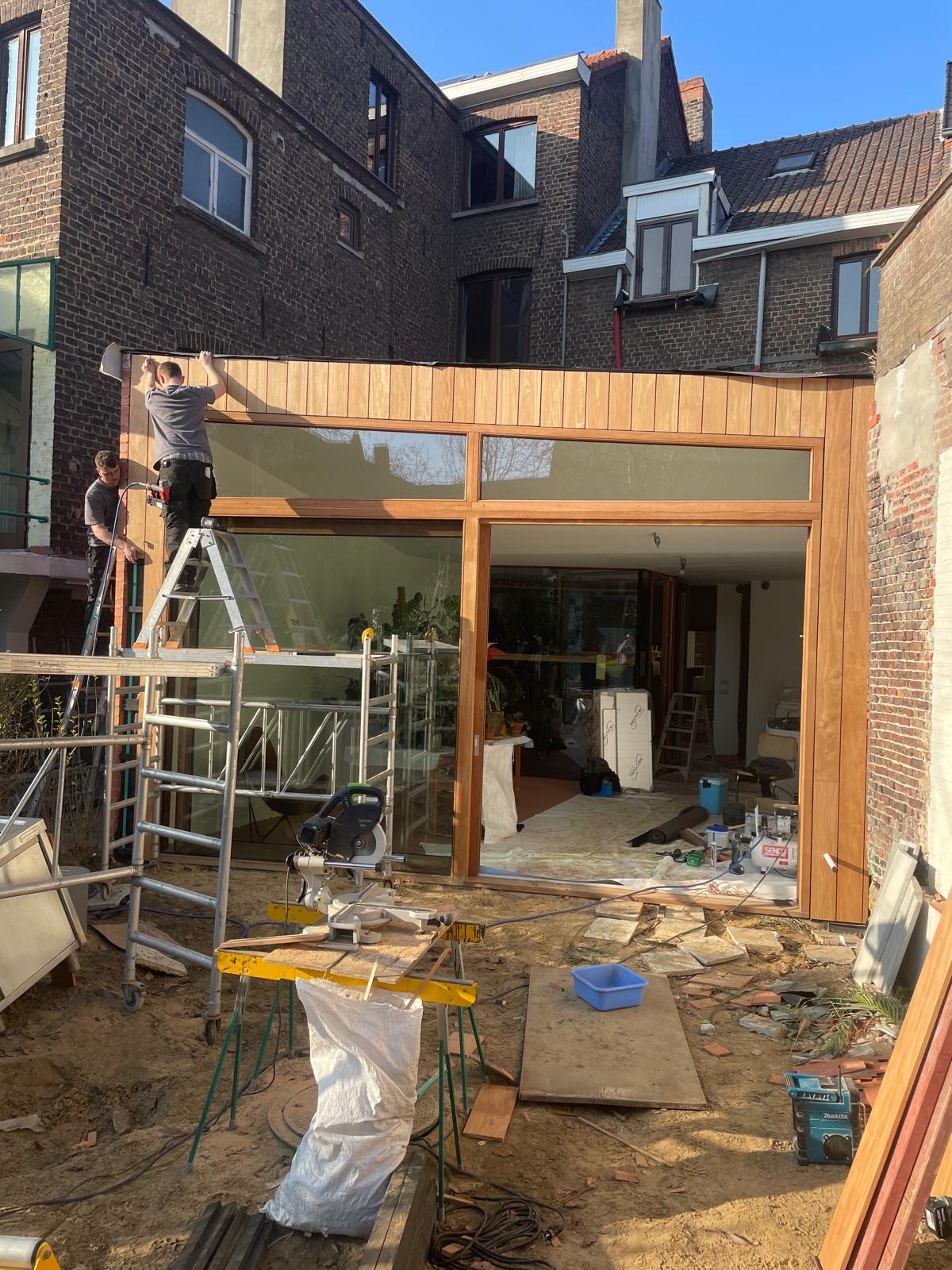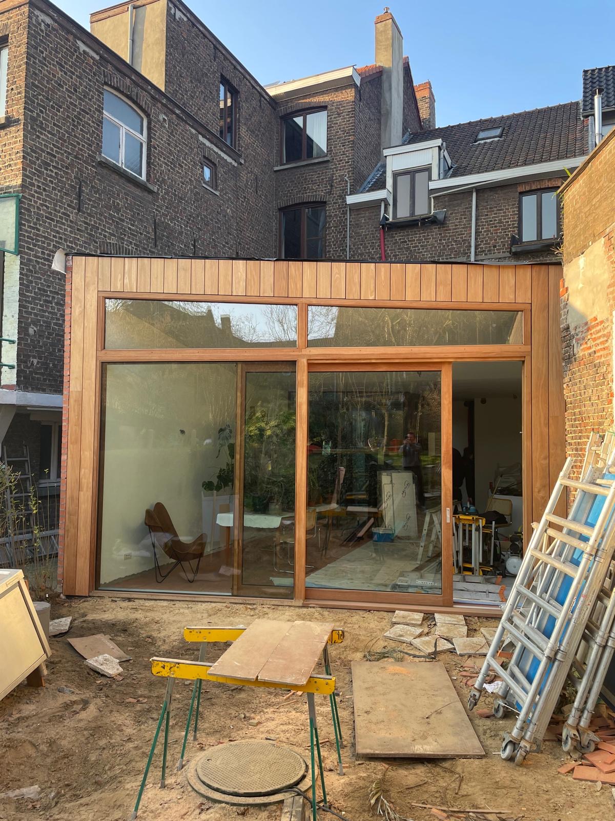 Voor deze woning realiseerden we een achterbouw in duurzaam Afzelia hout. De warme kleur en strakke lijnen van het hout zorgen voor een stijlvolle, natuurlijke uitstraling die mooi aansluit bij de bestaande gevel. Dankzij de grote glaspartij komt er veel licht binnen en ontstaat er een open verbinding met de tuin. Afzelia is bovendien zeer weerbestendig, waardoor deze achterbouw zowel esthetisch als duurzaam is.
