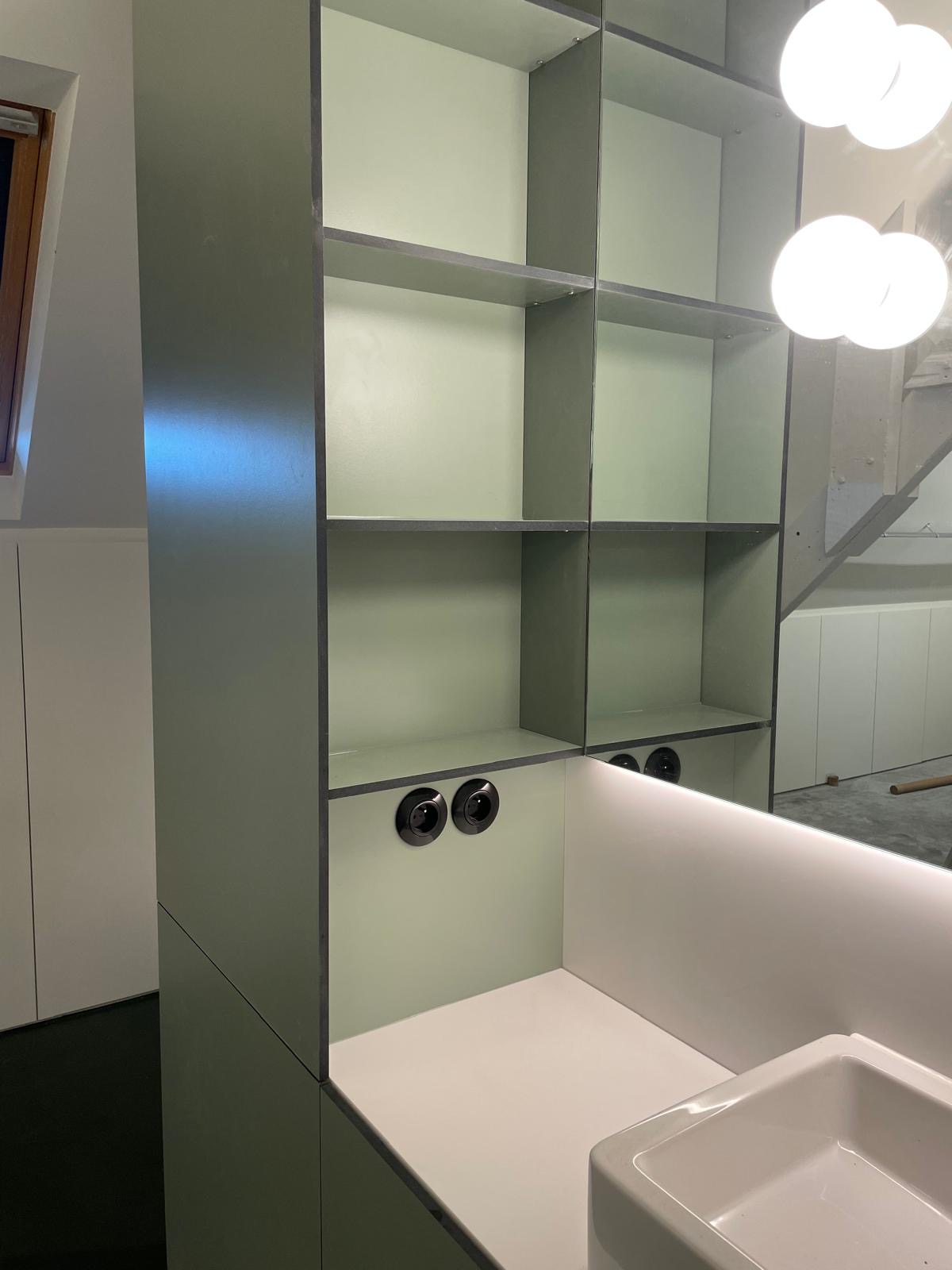 Voor deze badkamer maakten we een strak maatwerkmeubel afgewerkt met duurzame Trespa-panelen. De combinatie van de zwevende wastafel, geïntegreerde kasten en subtiele verlichting zorgt voor een elegante en moderne uitstraling. Trespa is bijzonder sterk, vochtbestendig en onderhoudsvriendelijk, waardoor dit meubel zowel praktisch als stijlvol is.