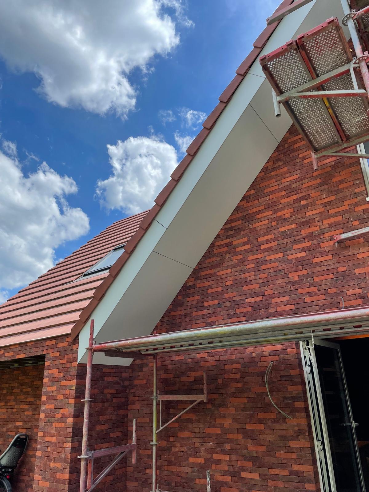Voor deze woning werkten we de dakoversteek af met Equitone-panelen. Het strakke, egale oppervlak geeft de gevel een moderne en verzorgde uitstraling. Equitone is duurzaam, onderhoudsvriendelijk en uitstekend bestand tegen weer en wind, waardoor deze afwerking een toekomstbestendige keuze is. Het resultaat is een nette, architecturale afwerking die perfect aansluit bij de bakstenen gevel.
