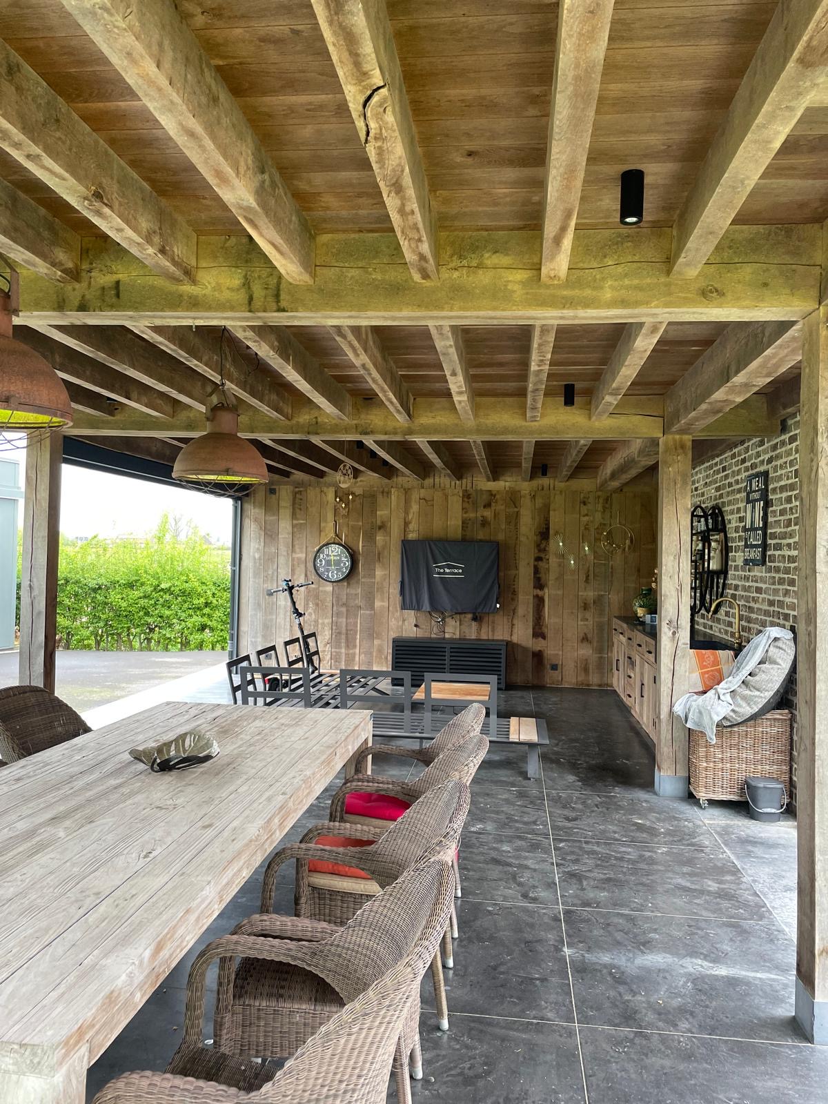 Voor dit project bouwden we een ruime terrasoverkapping in massief eikenhout. De natuurlijke uitstraling van het eikenhout zorgt voor een warme, gezellige sfeer en past perfect bij de landelijke omgeving. Dankzij de stevige constructie en fijne afwerking vormt deze overkapping een stijlvolle buitenruimte waar je het hele jaar door kan genieten van comfort en beschutting.
