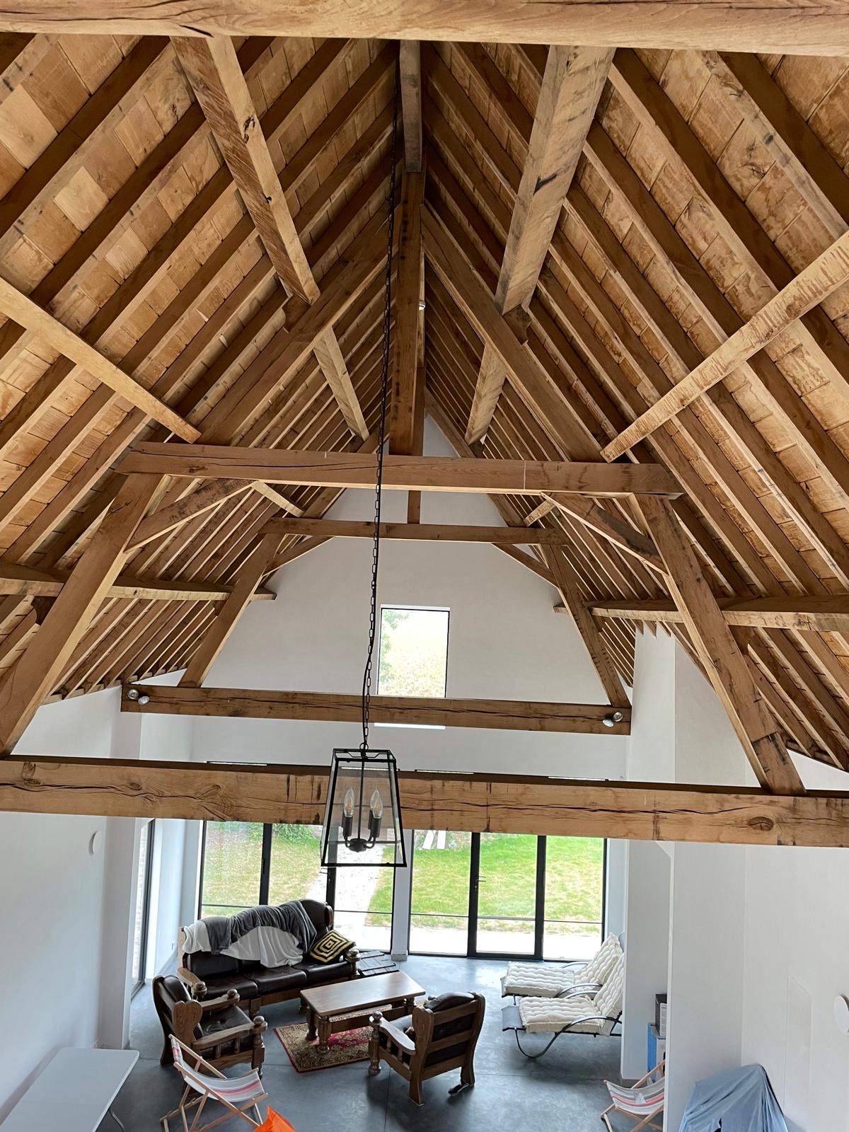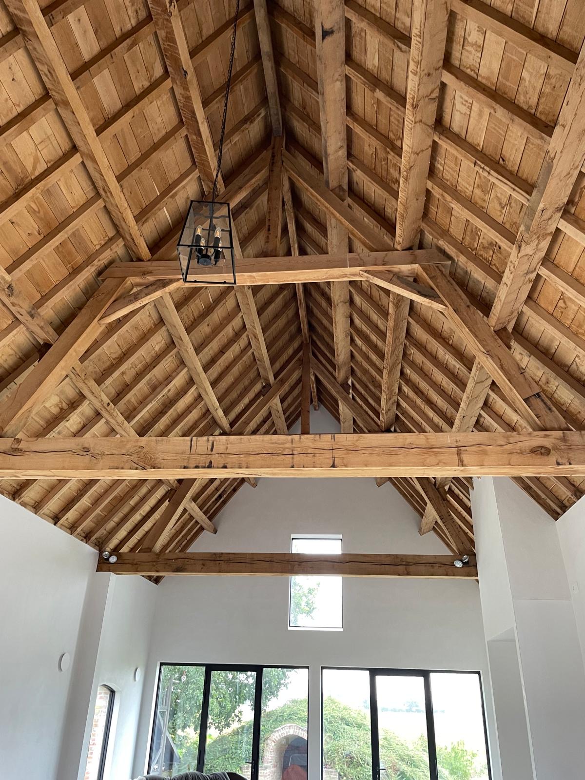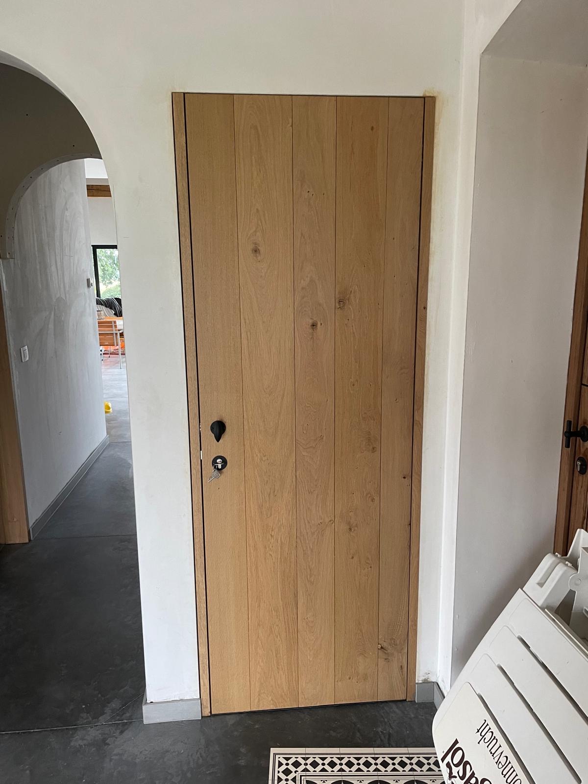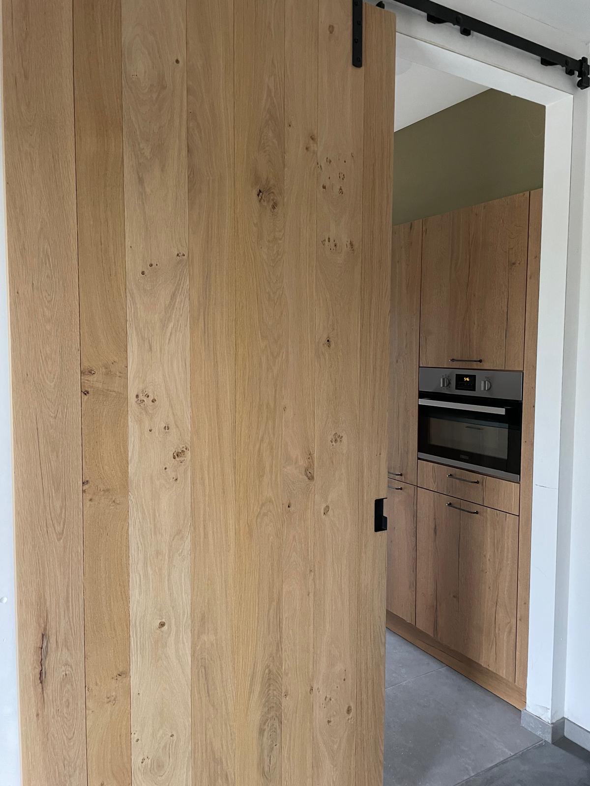 In dit project werkten we het interieur af met een massieve eiken dakconstructie en bijpassende binnendeuren. De zichtbare houten balken geven de ruimte een warme, authentieke uitstraling, terwijl de eiken deuren zorgen voor een stijlvolle, natuurlijke verbinding tussen de verschillende kamers. Dankzij de maatwerkafwerking sluiten alle elementen perfect op elkaar aan en ontstaat er een rustgevend, tijdloos geheel.