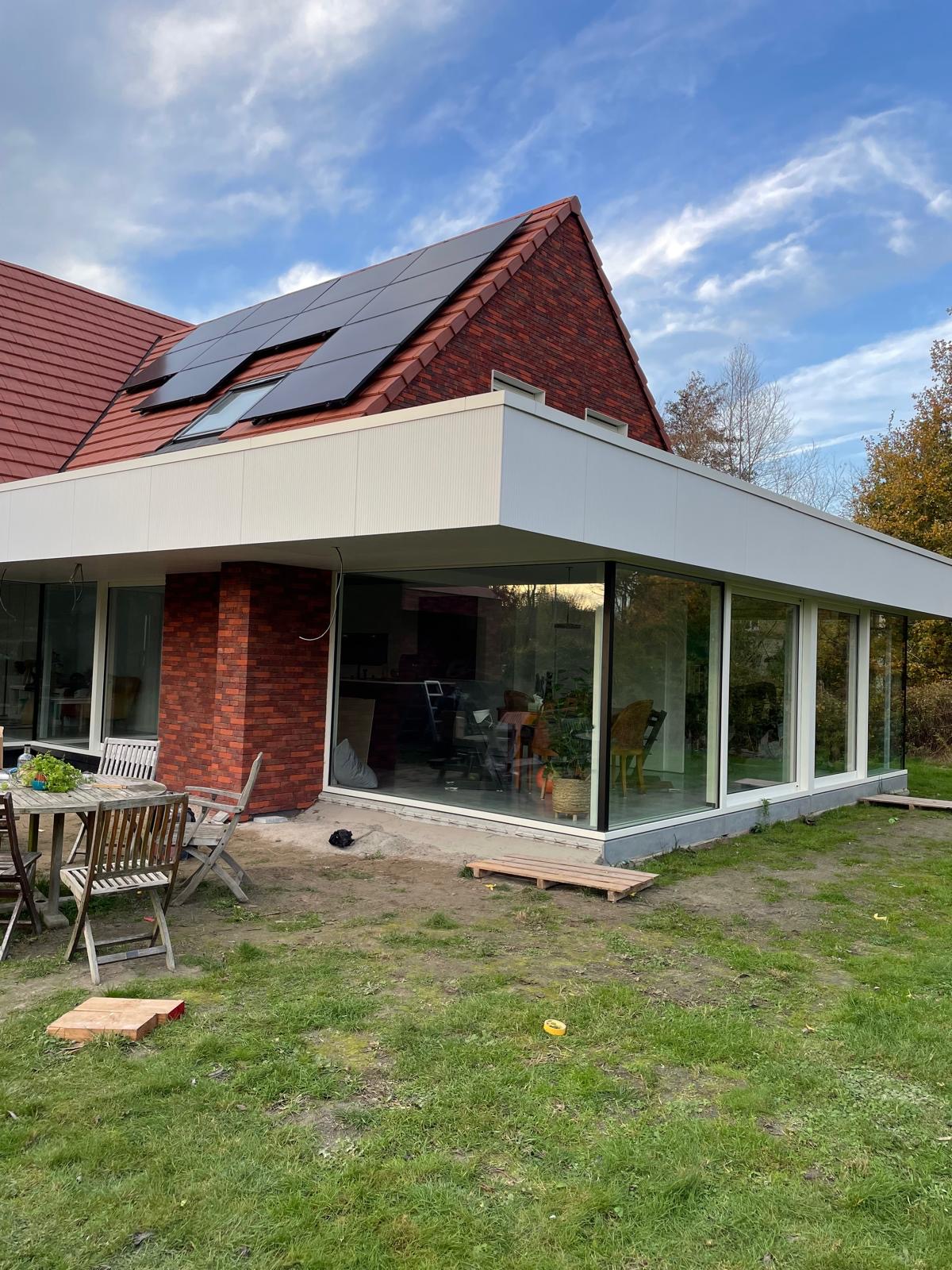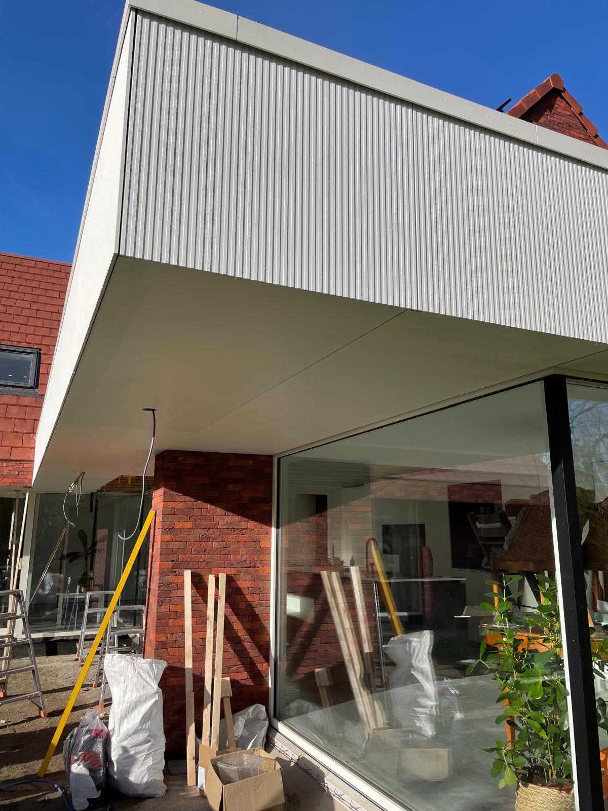 Voor deze woning realiseerden we een moderne uitbouw die volledig is afgewerkt met Equitone-gevelpanelen. De strakke lijnen en verticale textuur geven het volume een frisse, architecturale uitstraling. In combinatie met de grote glaspartij ontstaat een helder, eigentijds geheel dat zowel duurzaam als onderhoudsvriendelijk is. Equitone staat bekend om zijn weerbestendigheid en lange levensduur, waardoor deze uitbouw een stijlvolle én toekomstbestendige keuze vormt.