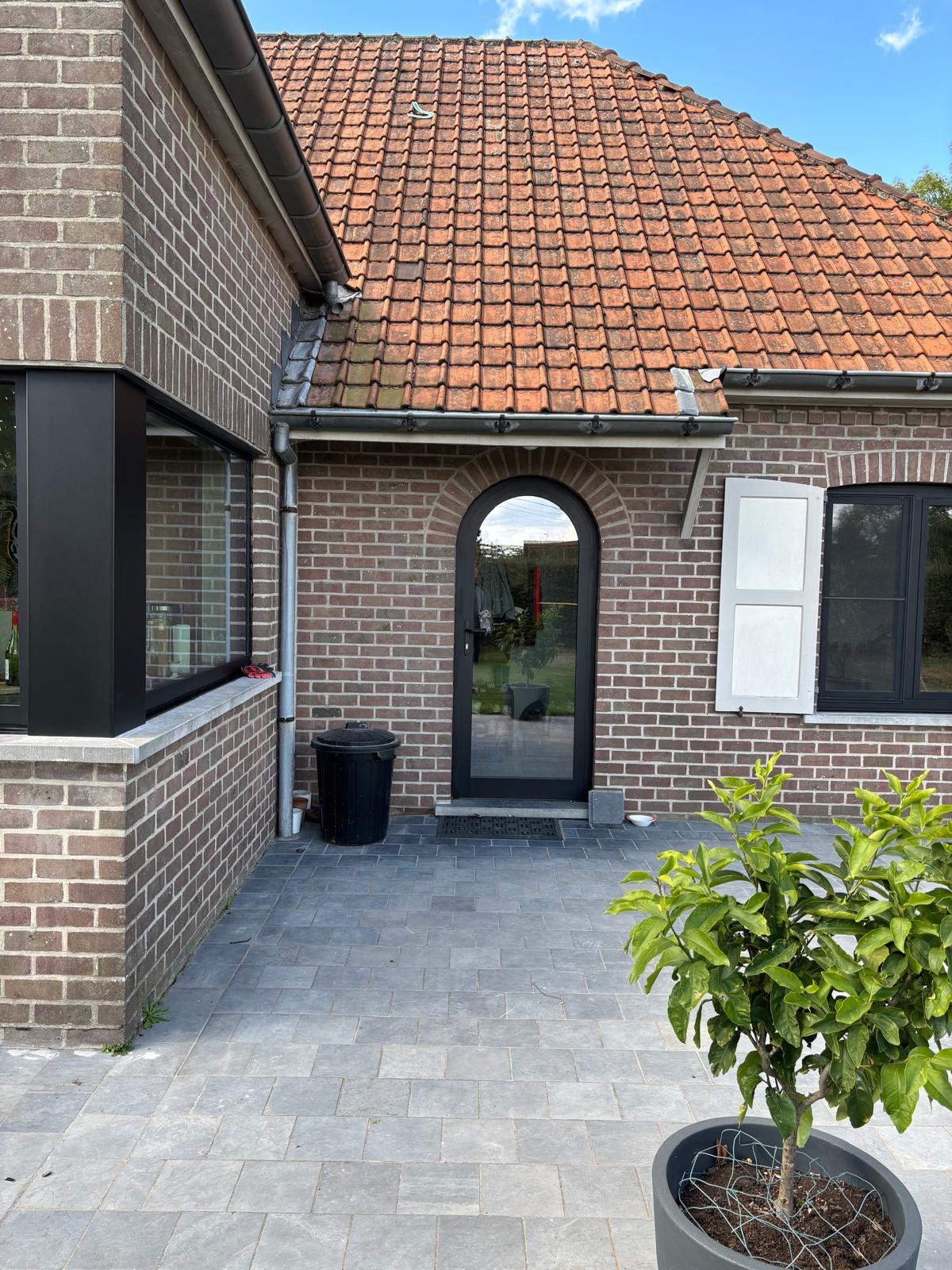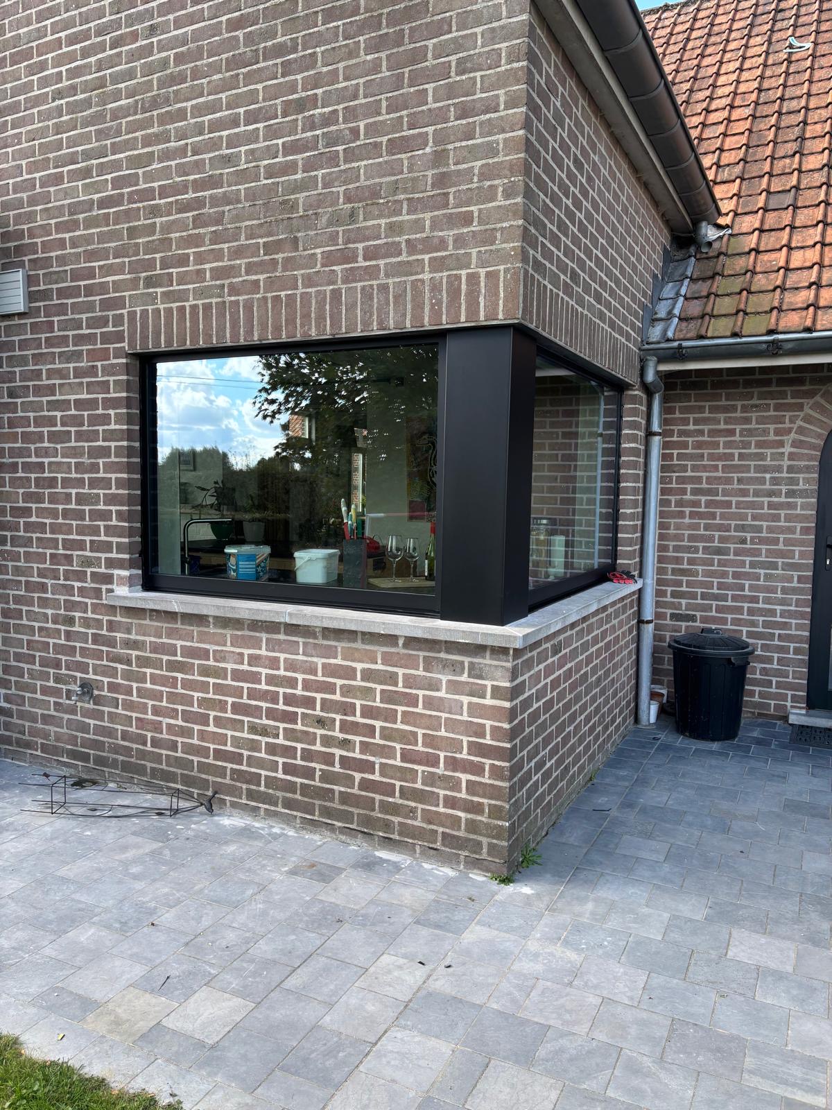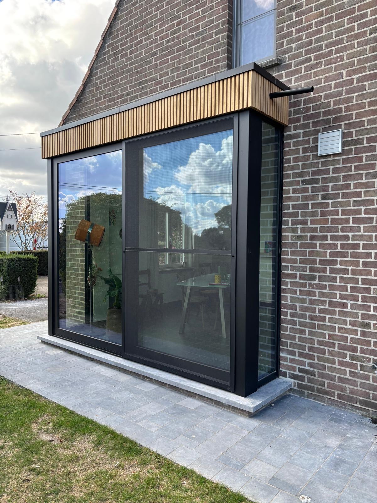 Voor dit project realiseerden we een moderne, compacte uitbouw met een nieuwe voordeur en raam in strak zwart aluminium. Het diepe zwart vormt een prachtig contrast met de warme houten latten die de bovenrand afwerken, waardoor de gevel een stijlvolle, hedendaagse uitstraling krijgt. De grote glaspartijen zorgen voor een overvloed aan natuurlijk licht binnen, terwijl de aluminium-profielen garant staan voor duurzaamheid, onderhoudsgemak en uitstekende isolatie.