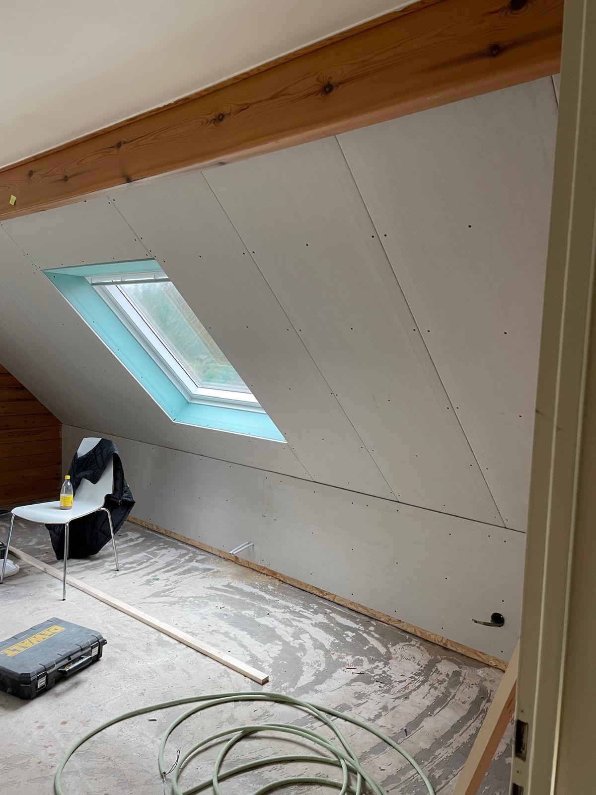 Voor dit project zorgden we voor een volledige gyprocafwerking van de bovenverdieping. Gyproc is ideaal voor renovaties omdat het snel geplaatst kan worden, een perfect vlak resultaat geeft en meteen klaar is voor schilder- of pleisterwerk. Dankzij de correcte opbouw met dampscherm en isolatie wordt de ruimte energiezuinig en comfortabel in elk seizoen. De nieuwe dakramen sluiten naadloos aan op de gyprocwanden, waardoor het geheel er strak, modern en ruim uitziet.