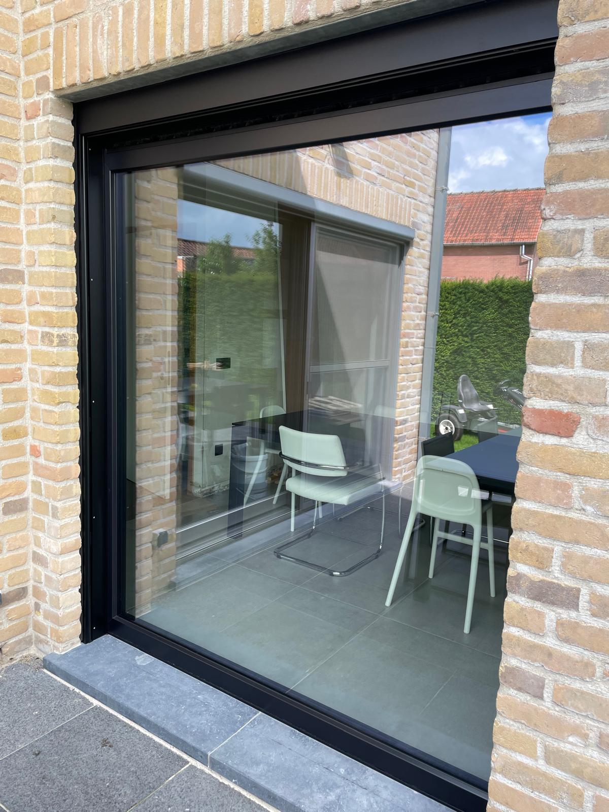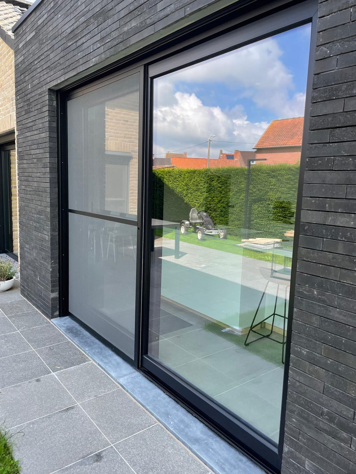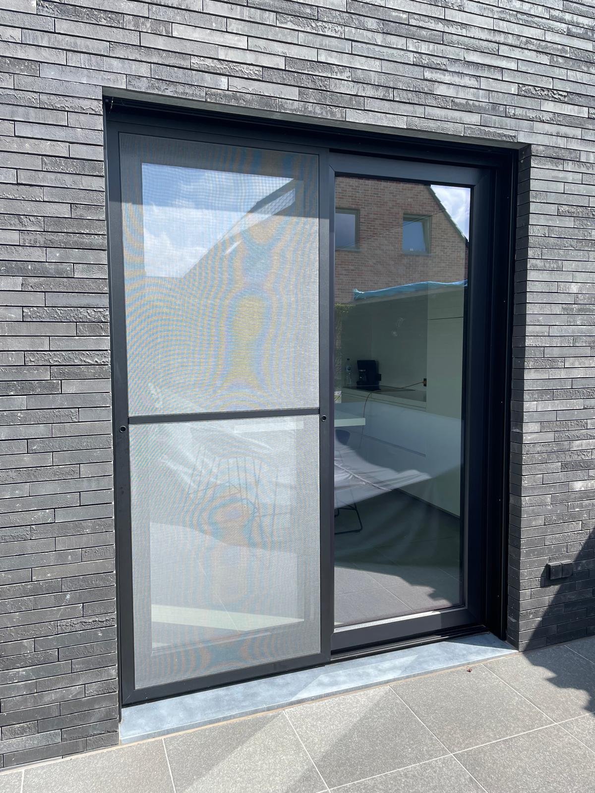 Voor dit project plaatsten we zwarte PVC-ramen en een bijpassende deur, aangevuld met een strak vliegenraam. PVC is vandaag een van de meest gekozen materialen dankzij zijn uitstekende isolatiewaarde en kleurvastheid — zelfs in donkere tinten zoals zwart blijft het materiaal vormstabiel. De combinatie van het slanke zwarte profiel en het geïntegreerde vliegenraam zorgt voor een moderne, onderhoudsvriendelijke afwerking die perfect aansluit bij de gevel.